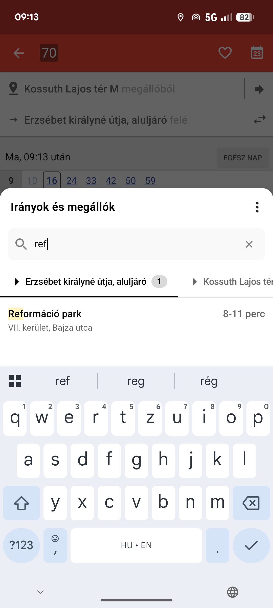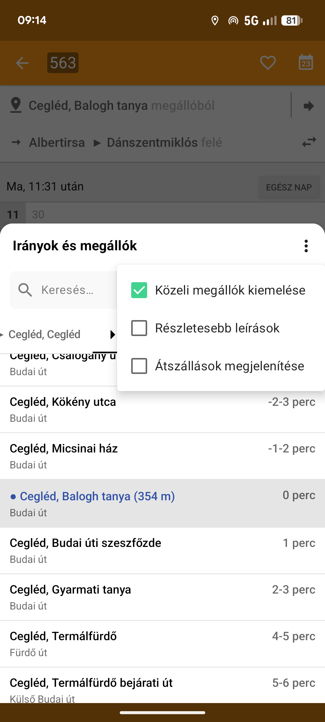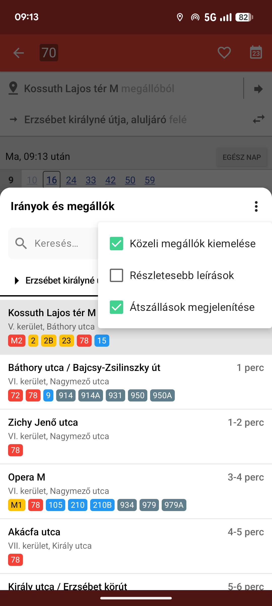 Keresés szövegesen (balra), átszállási lehetőségek megjelenítése (középen) és közeli megállók kiemelése (jobbra)