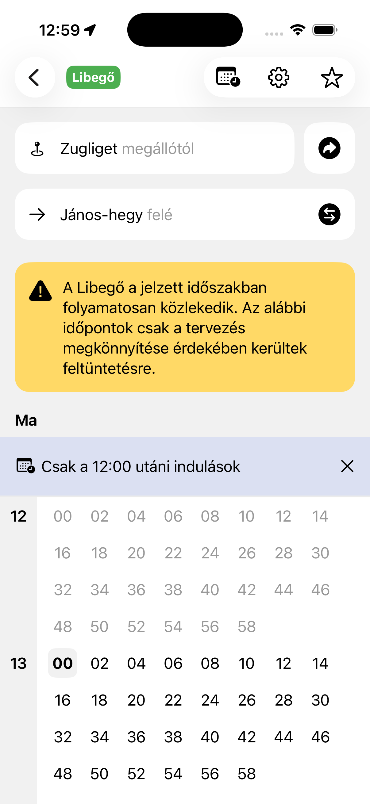 Az alkalmazásban az átláthatóság érdekében csak 2 percenként egy indulás jelenik meg, de a libegőre a valóságban a megjelölt időszakban folyamatosan (15-20 másodpercenként) fel lehet szállni. A menetrendek mellett megtalálhatod a libegő két végállomását, valamint az útvonalát és egy fotót is a járművek között. Az útvonaltervező – mivel a napi ingázásban nem lenne hasznos – nem tervez a libegővel.